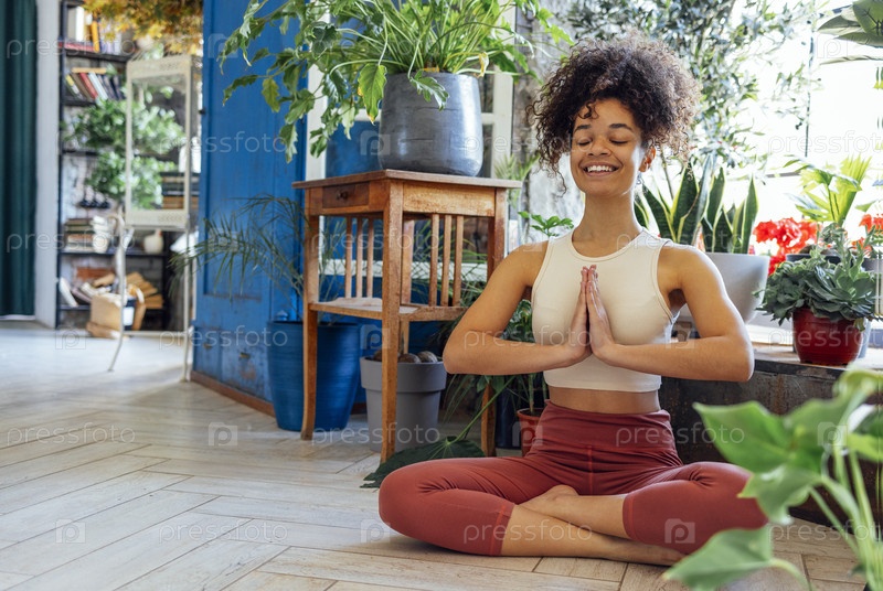 Афроамериканская этническая женщина в спортивной одежде сидит в позе йоги