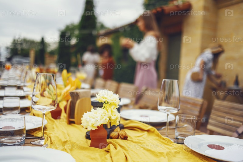 Банкет. Стулья и стол для гостей, украшенные свечами, сервируются столовыми приборами и посудой