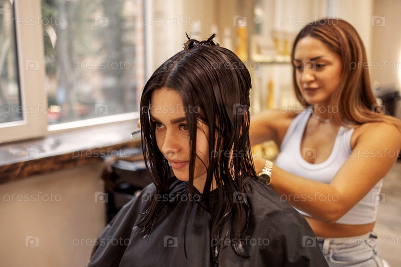Парикмахер стрижет волосы женщины во время работы в салоне красоты