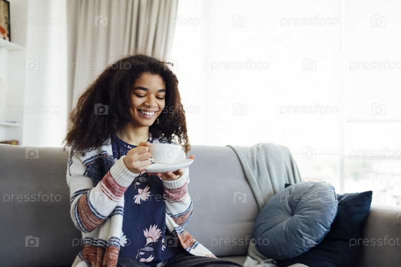 Веселая африканская американка отдыхает на диване с чашкой кофе, улыбаясь в камеру