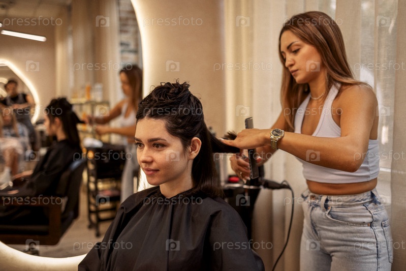 Парикмахер стрижет волосы женщины во время работы в салоне красоты