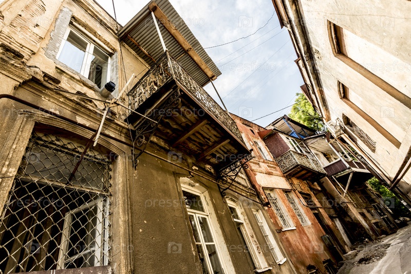 Узкая улица в старом городе Тбилиси, Грузия. Низкий угол обзора