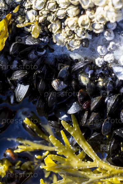 Морские водоросли и моллюски на мелководье, крупным планом