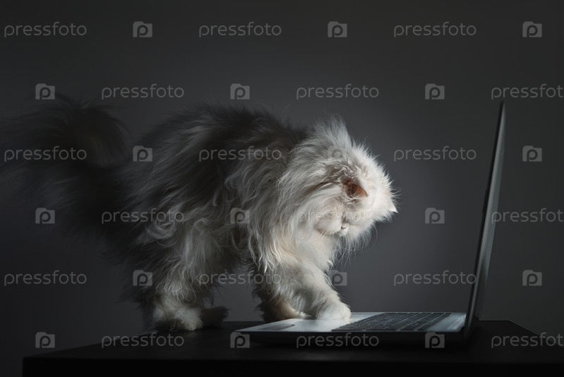 Забавный пушистый кот пользуется компьютером