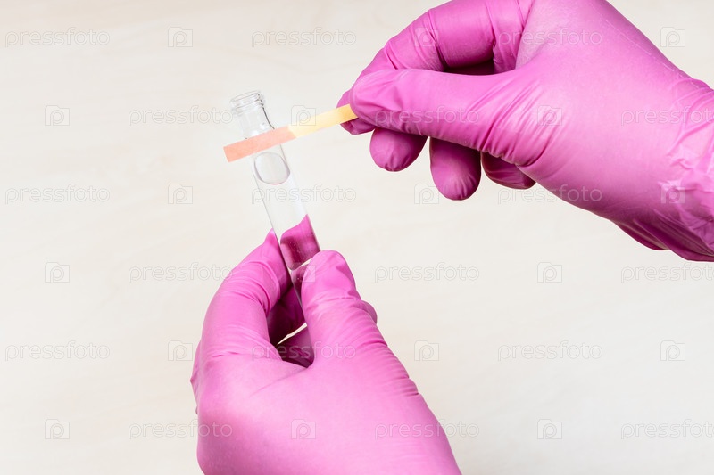 Руки держат розовую лакмусовую бумажку и пробирку