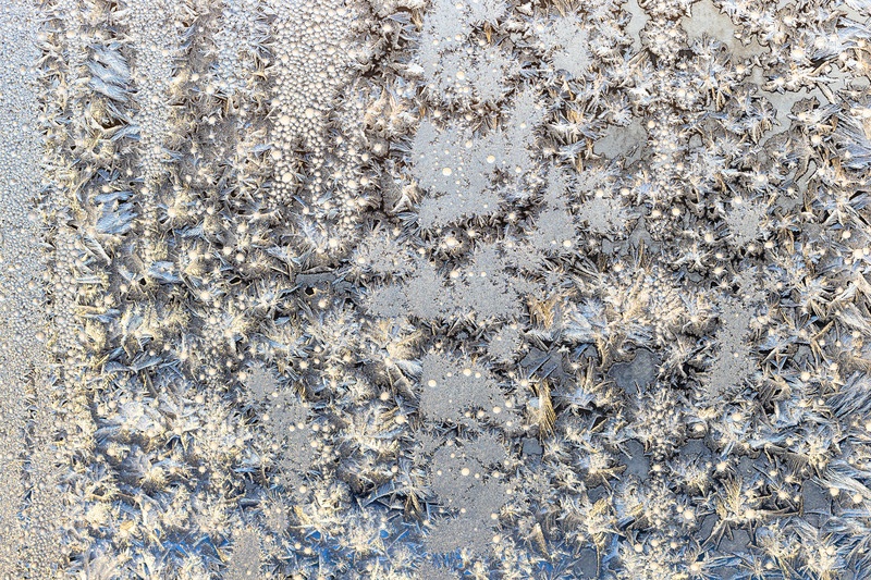 Залитый солнцем иней на поверхности оконного стекла дома