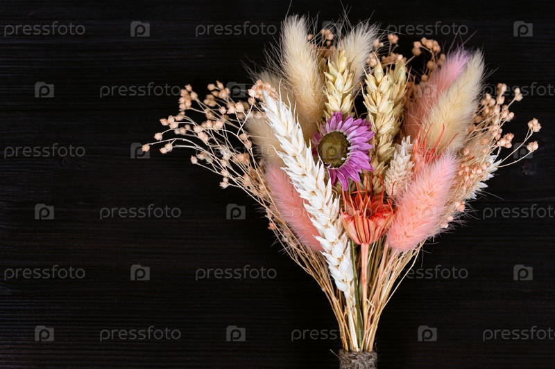 Связанный букет из сухоцветов и колосков на темном