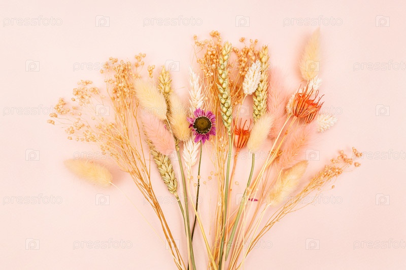 Сушеные растения на розовом пастельном фоне крупным планом