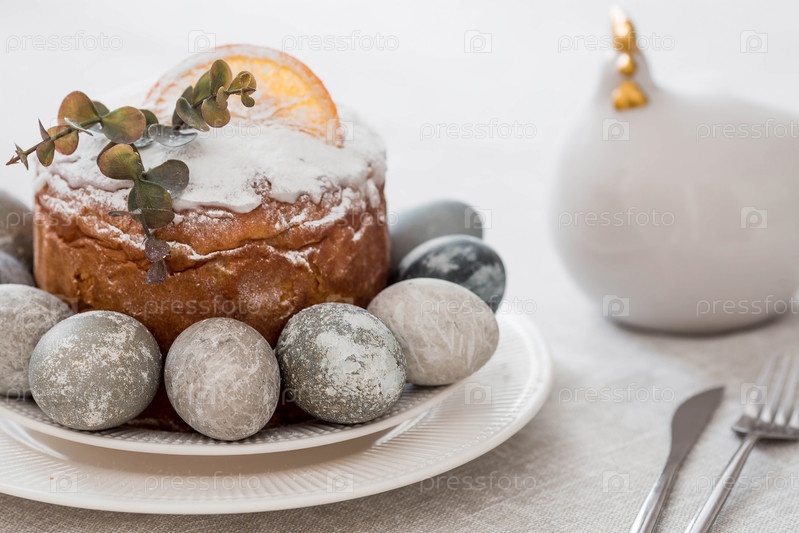 Весенняя сервировка стола. Тарелка с хлопковой салфеткой с зайчиком, тортом и пасхальными яйцами. Столовое серебро, пасхальные кролики и ваза с цветами на льняной скатерти. Концепция светлого праздника Пасхи
