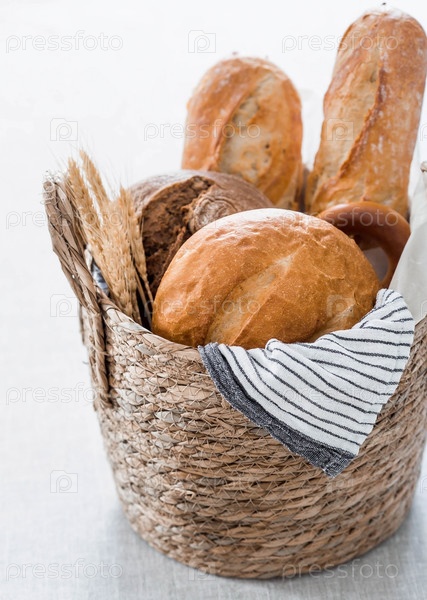 Ассортимент свежего хлеба в плетеной корзине крупным планом. Свежеиспеченный хлеб на столе. Контекст пекарни с вкусным хлебом. Кондитерские изделия