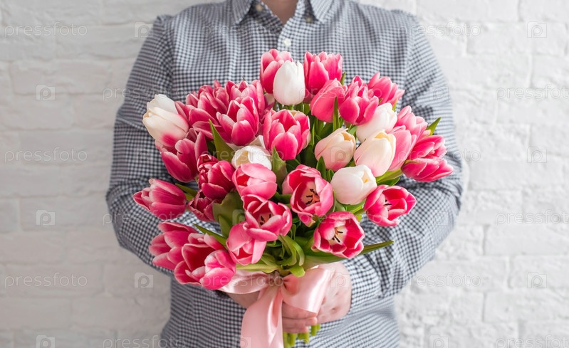 Баннер. Мужская рука держит красивый букет тюльпанов у стены из белого кирпича. Открытка на 8 марта и Международный женский день. Концепция поздравления и празднования
