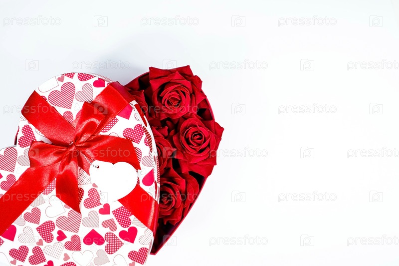 День Святого Валентина. Красные розы в белой коробке в виде сердца на белом фоне. Подарок женщинам на праздник. Концепция доставки цветов. флористика и цветочные магазины. Копировать пространство