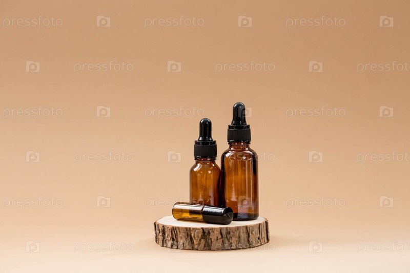 Натуральная органическая экокосметика. Макет брендинга салона красоты. Стеклянная бутылка-капельница на деревянной подставке на бежевом фоне