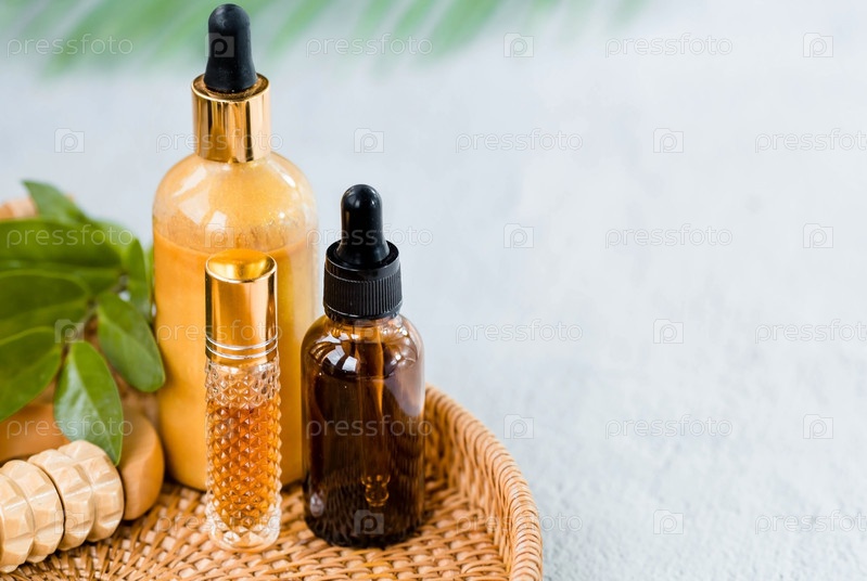 Ароматерапия. На подносе из ротанга стояла стеклянная бутылка с пипеткой для масла, лосьона, крема, массажная щетка и пальмовый лист. Натуральная органическая экокосметика. Макет брендинга салона красоты
