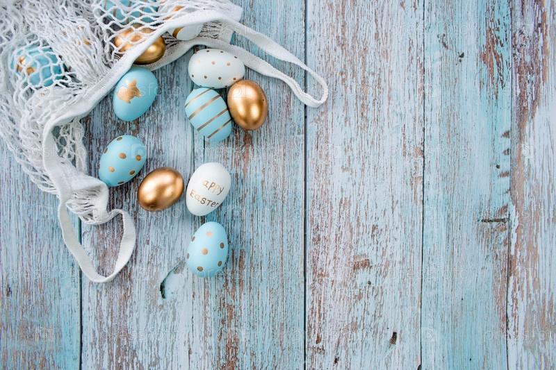 Золотые, черные, белые, синие яйца в авоське на синем деревянном фоне. Геометрия. Минимальная концепция. Вид сверху. Пасхальная открытка с копией места для текста