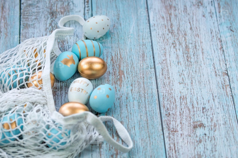 Золотые, черные, белые, синие яйца в авоське на синем деревянном фоне. Геометрия. Минимальная концепция. Вид сверху. Пасхальная открытка с копией места для текста