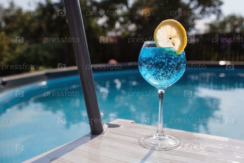 Стакан вкусного голубого коктейля Голубая лагуна и желтые лимоны на фоне бассейна. Алкогольный коктейль из сочных фруктов блю с ликером кюрасао, кубиками льда и долькой лимона