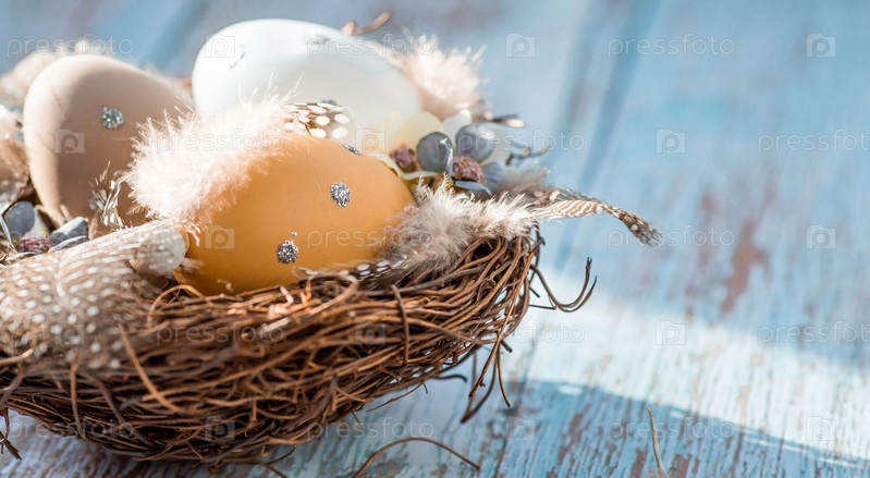 Пасхальные яйца, перья в гнезде на синем деревянном фоне. Минимальная концепция. Вид сверху. Карточка с копией места для текста