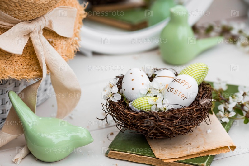 Баннер. Бело-зеленые яйца, вишневые цветы в гнезде, старая книга и фарфоровые птицы на белом деревянном столе. Праздничная открытка на Пасху 2023 года в винтажном стиле