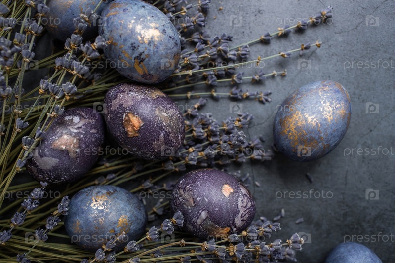 Фиолетовые, синие и золотые яйца с лавандой на темном фоне. Тенденция фиолетового оттенка 2022 года очень актуальна. Чай каркаде с натуральным красителем. Вид сверху. Пасхальная открытка с копией места для текста