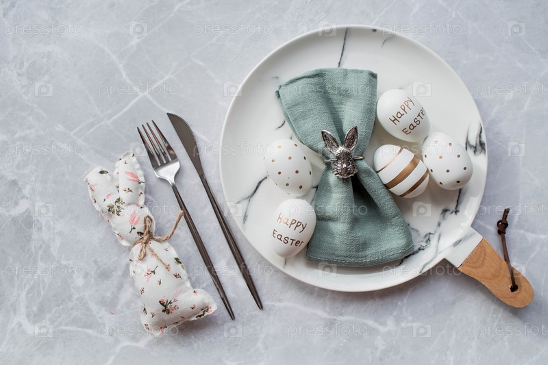 Баннер. Сервировка стола. Модная мраморная тарелка с кроликом на салфетке, пасхальными яйцами и перьями на сером фоне. Вид сверху. Концепция счастливого пасхального праздника для кафе и ресторанов