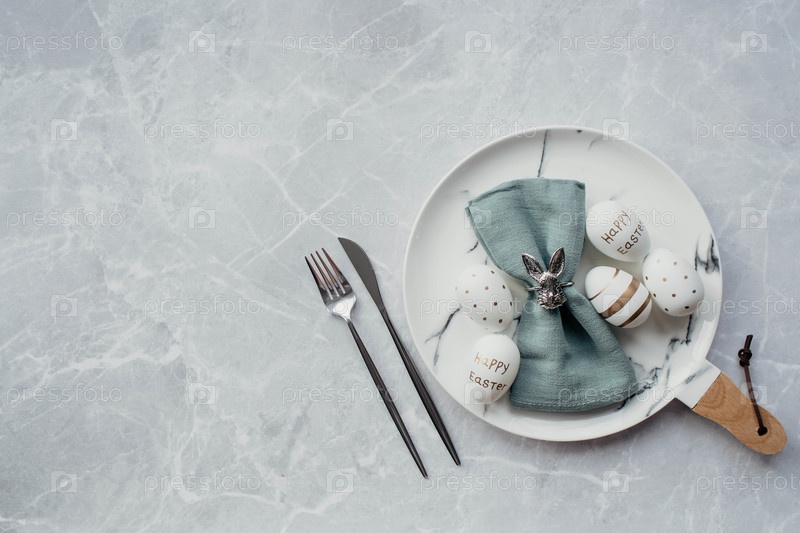 Баннер. Сервировка стола. Модная мраморная тарелка с кроликом на салфетке, пасхальными яйцами и перьями на сером фоне. Вид сверху. Концепция счастливого пасхального праздника для кафе и ресторанов