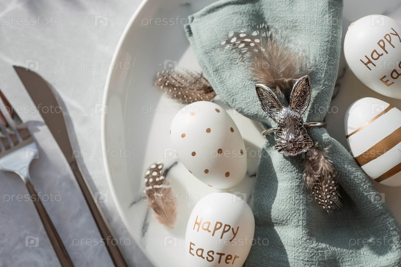 Баннер. Сервировка стола. Модная мраморная тарелка с кроликом на салфетке, пасхальными яйцами и перьями на сером фоне. Вид сверху. Концепция счастливого пасхального праздника для кафе и ресторанов