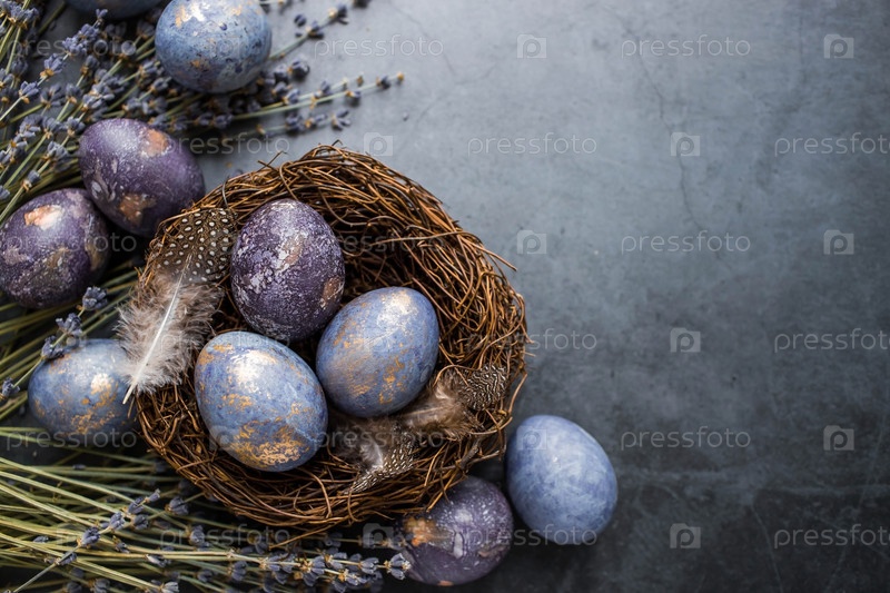 Пасхальная открытка с копией места для текста. Фиолетовые, синие и золотые яйца с лавандой на темном фоне. Тенденция фиолетового оттенка 2022 года очень актуальна. Чай каркаде с натуральным красителем. Вид сверху
