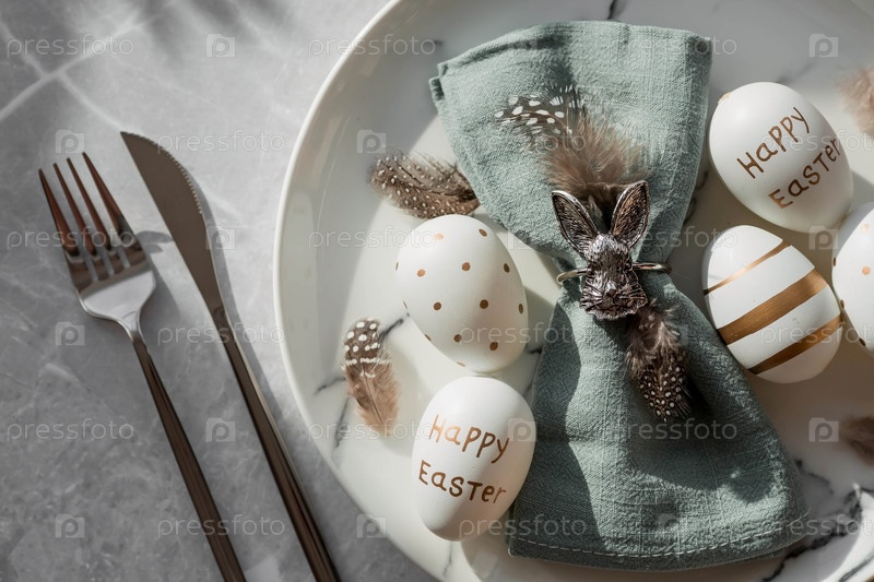 Баннер. Сервировка стола. Модная мраморная тарелка с кроликом на салфетке, пасхальными яйцами и перьями на сером фоне. Вид сверху. Концепция счастливого пасхального праздника для кафе и ресторанов