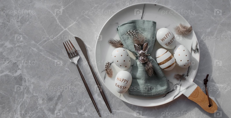 Баннер. Сервировка стола. Модная мраморная тарелка с кроликом на салфетке, пасхальными яйцами и перьями на сером фоне. Вид сверху. Концепция счастливого пасхального праздника для кафе и ресторанов