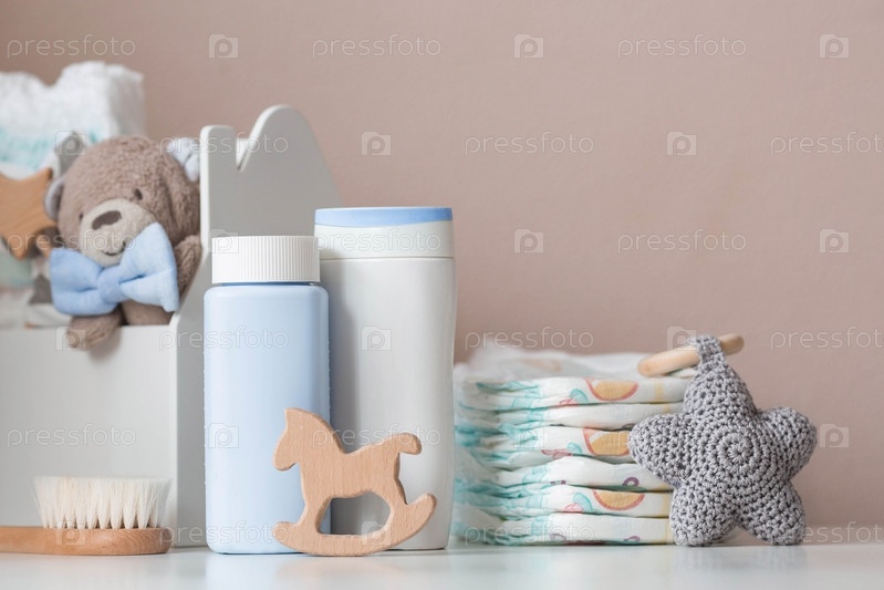 Деревянные игрушки, мишка в галстуке-бабочке, стопка подгузников, бутылочки без этикеток и детские принадлежности на пеленальном столике. Место для текста