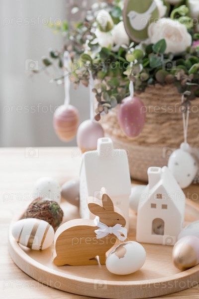 Красивая открытка. Концепция праздника Светлой Пасхи. Цветы, кролики, пасхальные яйца и скандинавские белые домики на деревянном столе в уютной гостиной