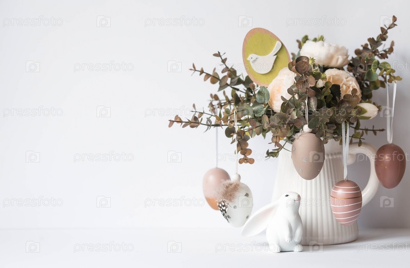 Красивая открытка. Баннер. Концепция светлого праздника Пасхи. Букет цветов, белые кролики и пасхальные яйца на белом изолированном фоне