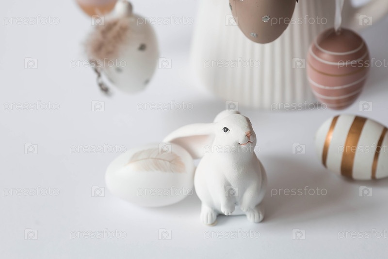 Красивая открытка. Баннер. Концепция светлого праздника Пасхи. Букет цветов, белые кролики и пасхальные яйца на белом изолированном фоне