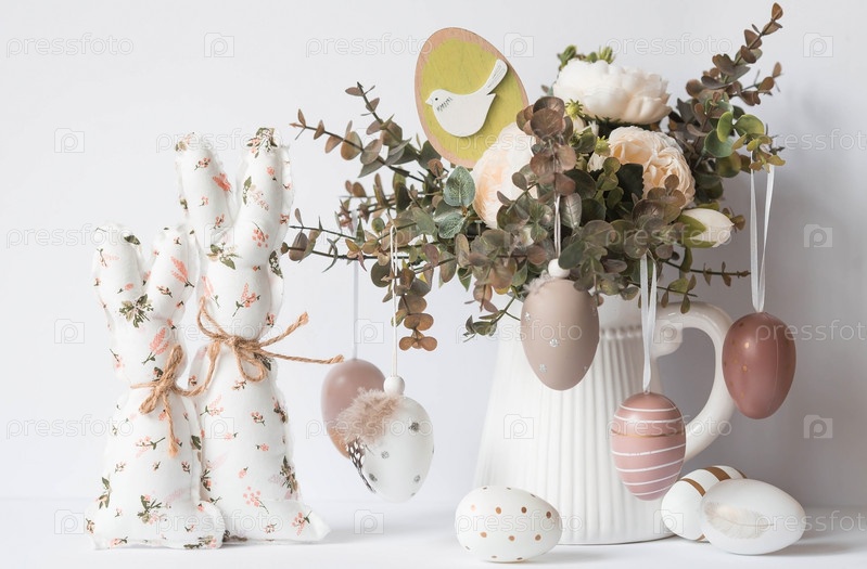 Красивая открытка. Баннер. Концепция светлого праздника Пасхи. Букет цветов, белые кролики и пасхальные яйца на белом изолированном фоне