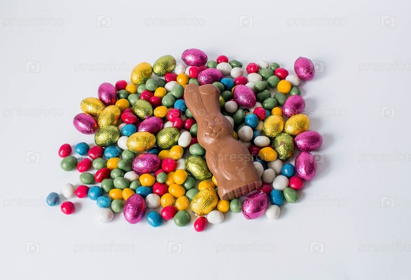 Красивая открытка. Баннер. Концепция светлого праздника Пасхи. Шоколадные пасхальные яйца и шоколадный кролик на белом изолированном фоне. Сладости и сладости