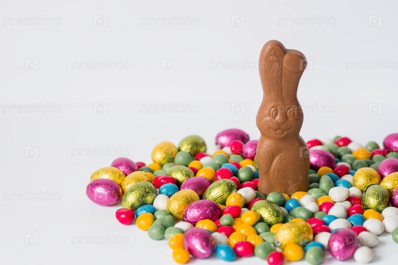 Красивая открытка. Баннер. Концепция светлого праздника Пасхи. Шоколадные пасхальные яйца и шоколадный кролик на белом изолированном фоне. Сладости и сладости