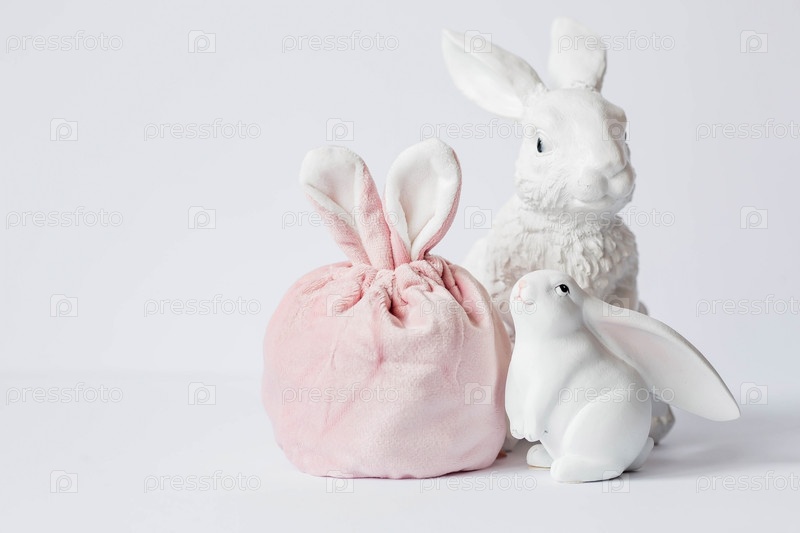 Красивая открытка. Баннер. Концепция светлого праздника Пасхи. Белые кролики и пасхальные яйца на белом изолированном фоне