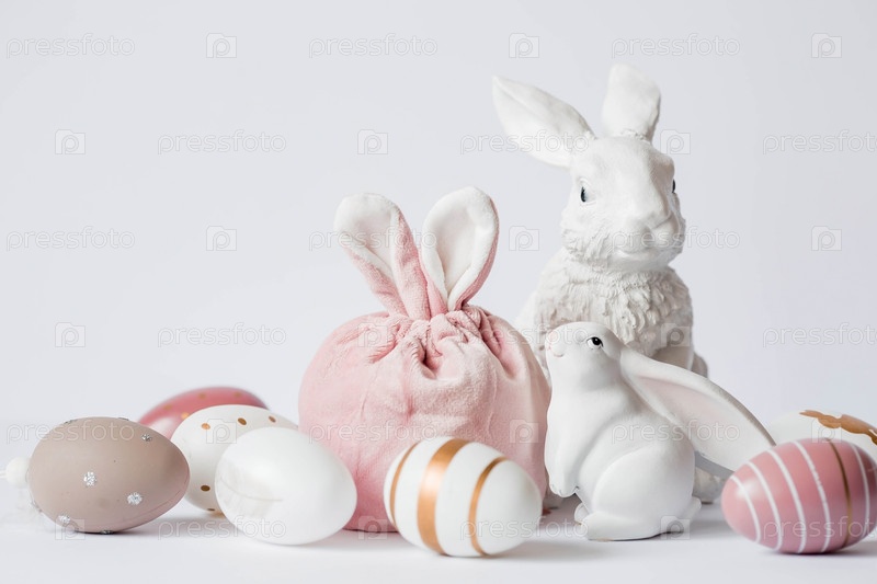 Красивая открытка. Баннер. Концепция светлого праздника Пасхи. Белые кролики и пасхальные яйца на белом изолированном фоне