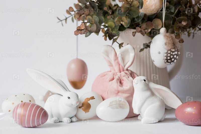 Красивая открытка. Баннер. Концепция светлого праздника Пасхи. Букет цветов, белые кролики и пасхальные яйца на белом изолированном фоне