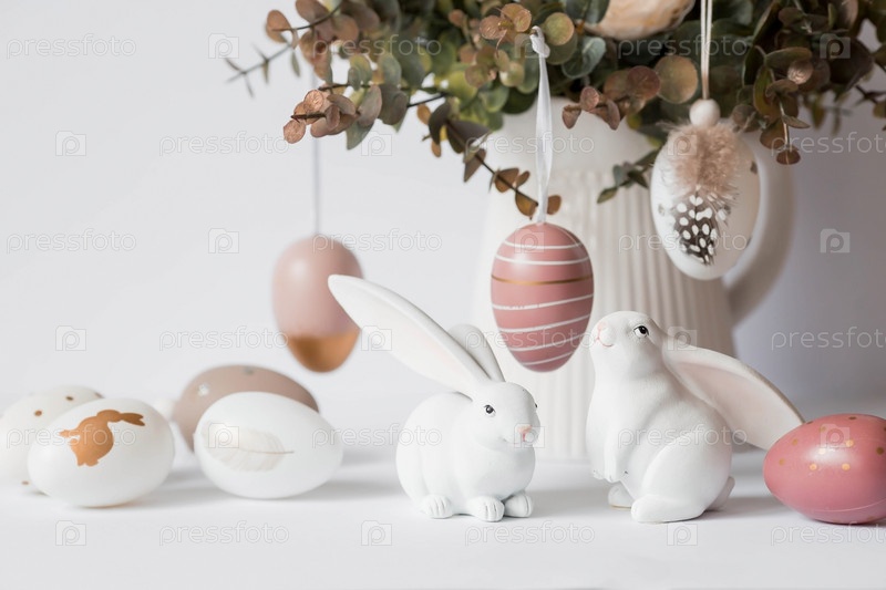 Красивая открытка. Баннер. Концепция светлого праздника Пасхи. Букет цветов, белые кролики и пасхальные яйца на белом изолированном фоне