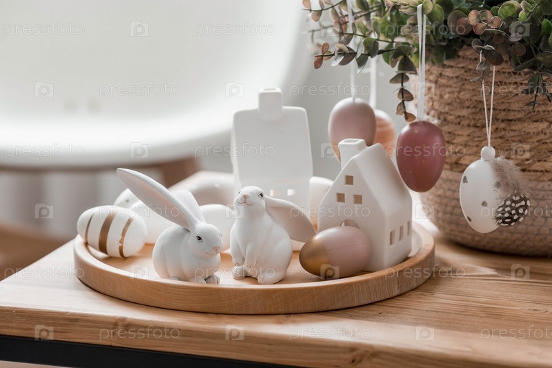 Красивая открытка. Концепция праздника Светлой Пасхи. Цветы, кролики, пасхальные яйца и скандинавские белые домики на деревянном столе в уютной гостиной