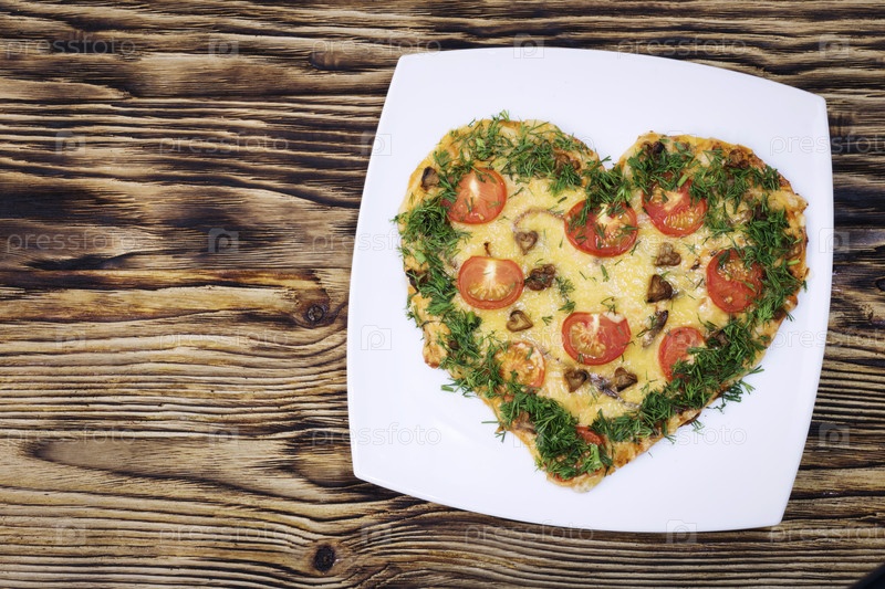 Еда на День Святого Валентина. Пицца в форме сердца с зеленью, на белой тарелке, на темном деревянном фоне. Вид сверху. Копировать пространство