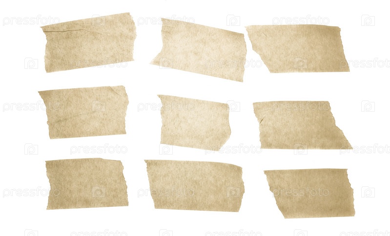 Коллекция желтой клейкой ленты в возрасте. Коллекция различных клейких лент. Скотч изолирован на белом фоне. Копировать пространство