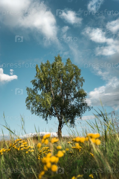 Одинокая береза растет на лугу. Желтые цветы на переднем плане