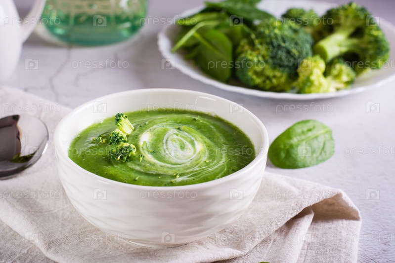 Суп-пюре из свежей брокколи в миске на столе. Вегетарианская пища