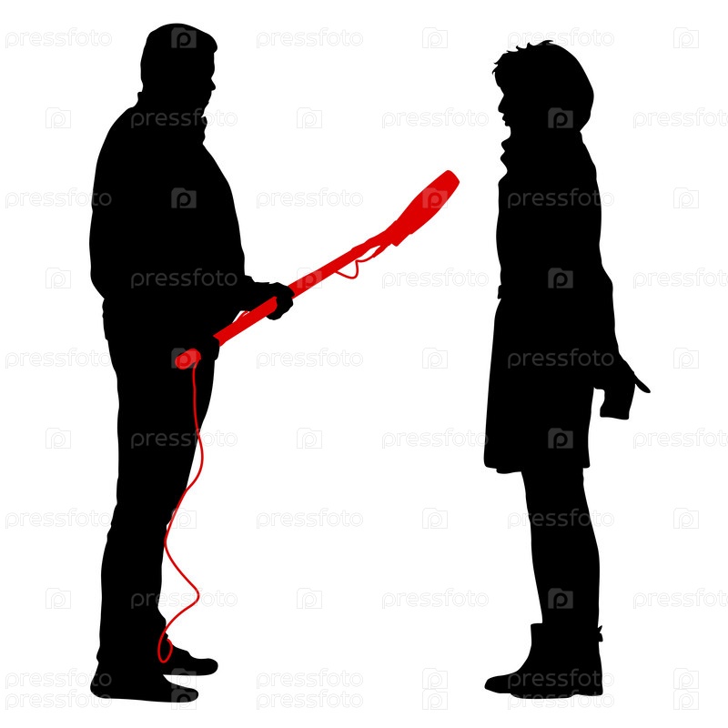 Оператор силуэта удаляет журналиста с микрофоном на белом фоне