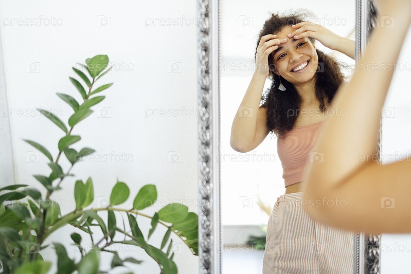 Улыбающаяся африканская девочка-подросток, проверяющая проблемы с кожей лица, смотрит в зеркало
