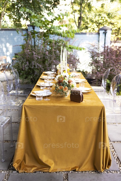 Прически и стол для гостей, украшенный свечами, сервируется столовыми приборами и посудой