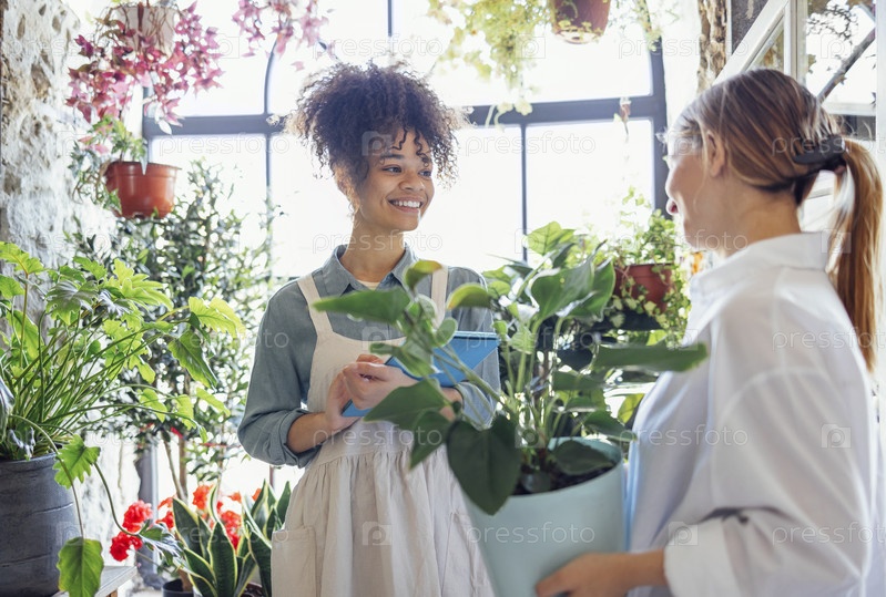 Счастливая чернокожая женщина-предприниматель, стоящая в магазине растений и продающая клиенту свежие цветы